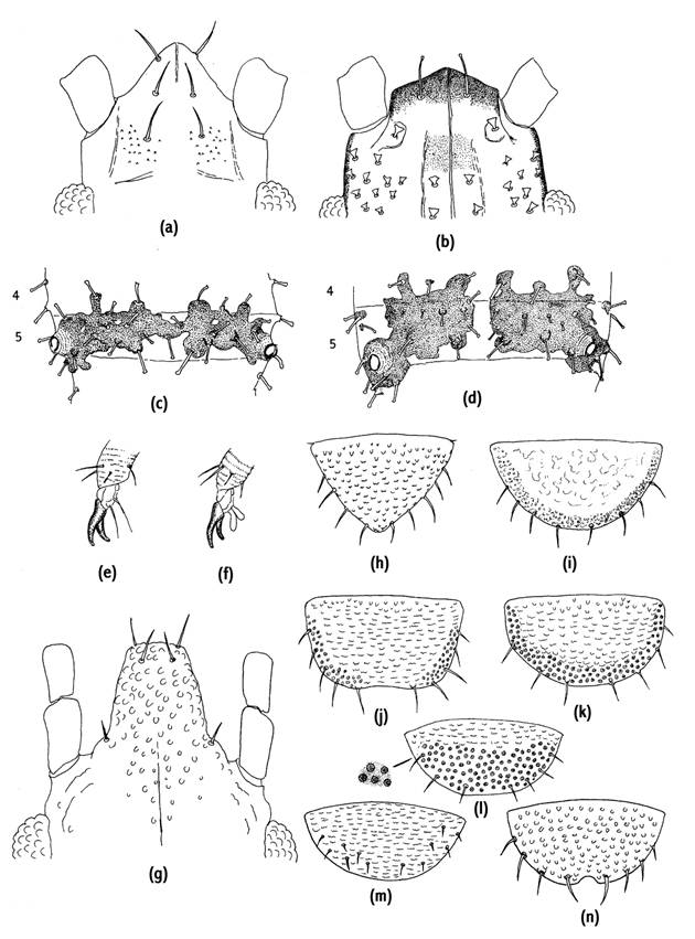 Fig.19 Apterae on Carex II; (a) Front of head of Saltusaphis elongatus, (b) Front of head of Saltusaphis scirpus, (c) Sclerotisation of ABD TERG 4 and 5 of Iziphya ingegardae; (d) Same for Iziphya americana, (e) Empodial hairs of Allaphis producta, (f) Empodial hairs of Thripsaphis ballii, (g) Front of head of Allaphis daviaulti, (h-n) ABD TERG 8 of (h) A. producta, (i) A. ossiannilssoni, (j) A. californica, (k) A. utahensis, (l) A. cyperi, (m) A. scabra, (n) A. verrucosa.