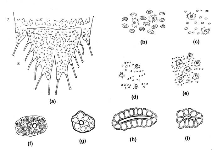 Fig.20 Apterae on Carex III; (a) Processes on ABD TERG 7 and 8 of Neosaltusaphis bodenheimeri, (b) Part of ABD TERG 3 of Subsaltusaphis pallida in pleural region, (c) Same for S. flava, (d) Same for S. rossneri, (e) Same for S. ornata, (f) Marginal wax gland on ABD TERG 3 of Zelkovaphis caucasica, (g) Same for Colopha kansugei, (h) Same for Paracolopha takahashii (after Akimoto), (i) Same for Colopha compressa.