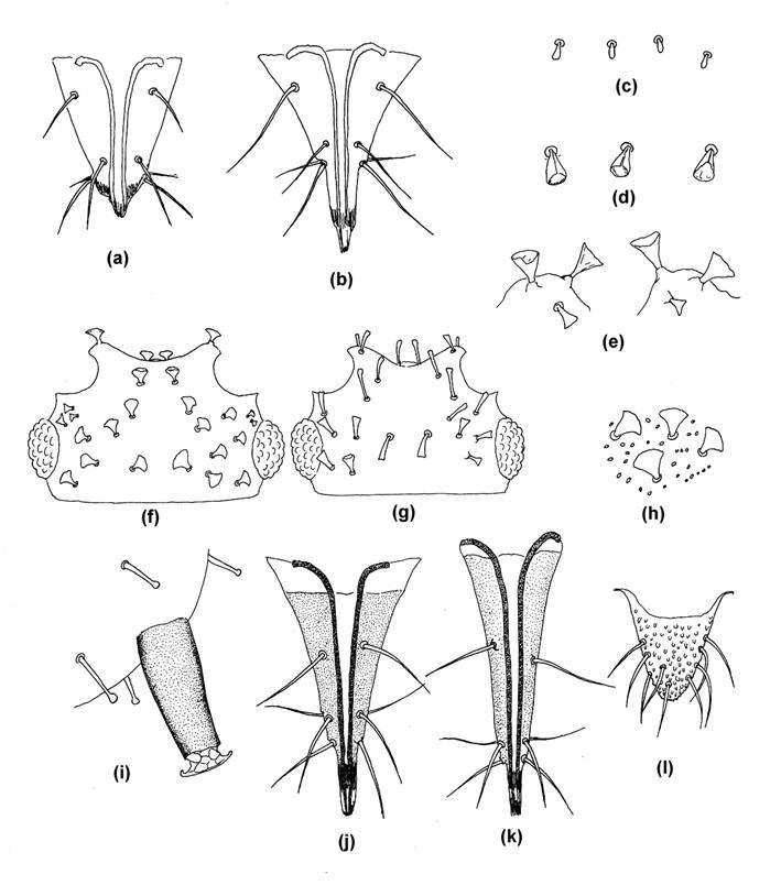 Fig.21 Apterae on Chrysothamnus; (a) R IV+V of Pleotrichophorus pycnorhysus, (b) R IV+V of P. gregarius, (c) Dorsal abdominal hairs of P. magnautensus, (d) Same for P. utensis, (e) Spinal abdominal tubercles and hairs of P. gregarius, (f) Dorsal cephalic hairs of P. elongatus, (g) Same for P. packi, (h) Dorsal abdominal hairs and spicules of P. oestlundi, (i) SIPH and dorsal abdominal hairs of Durocapillata utahensis, (j) R IV+V of Aphis chrysothamni, (k) R IV+V of Aphis chrysothamnicola, (l) CAUDA of Aphis ornata.