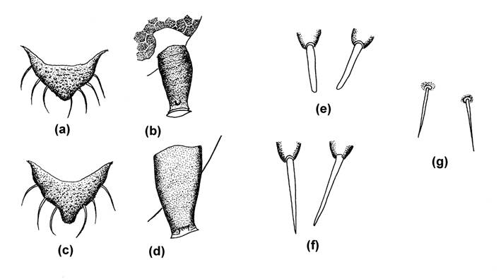 Fig.27 Apterae on Eriogonum; (a) CAUDA of Braggia eriogoni, (b) SIPH of B. eriogoni, (c) CAUDA of B. urovaneta, (d) SIPH of B. urovaneta, (e) Dorsal hairs of B. echinata (paratype), (f) Dorsal hairs of B. uncompahgrensis (paratype), (g) Dorsal hairs of B. eriogoni.