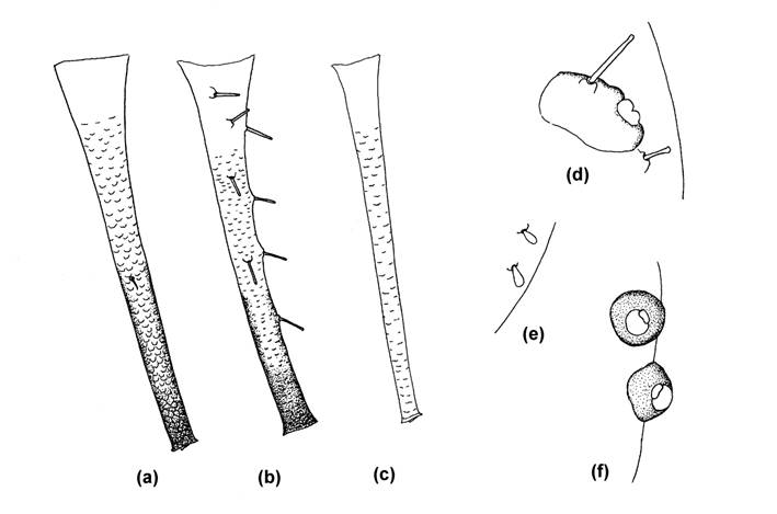 Fig.30 Apterae on Geranium; (a) SIPH of Macrosiphum aetheocornum; (b) SIPH of Nasonovia crenicorna, (c) SIPH of Acyrthosiphon malvae; (d) Marginal tubercle and hairs of Amphorophora tuberculata, (e) Dorsal abdominal hairs of Indoidiopterus geranii, (f) Spiracular plates on abdominal segments 1 and 2 of I. geranii (ventral view).