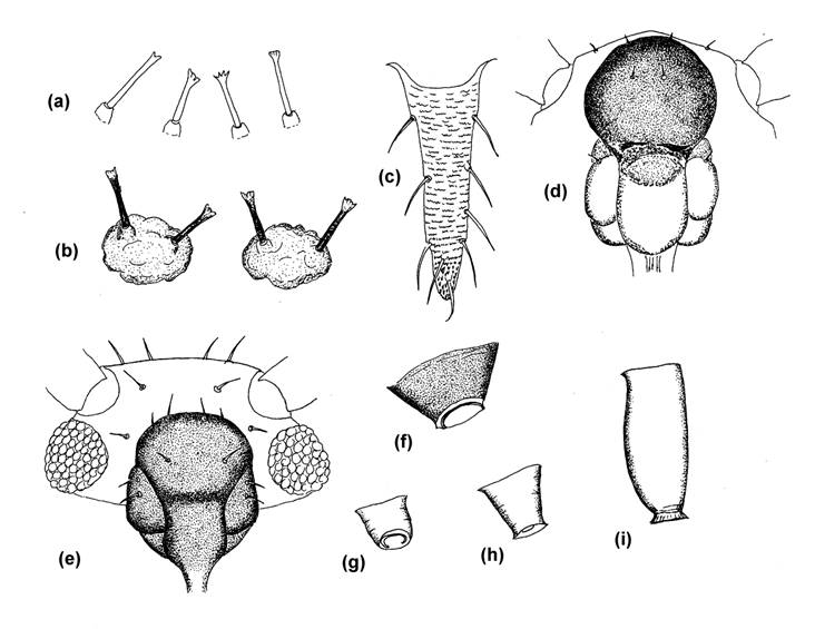 Fig.36 Apterae on Kochia (also Salsola and Suaeda); (a) Dorsal hairs of Chaitaphis tenuicauda, (b) Dorsal hairs of Ch. safavii, (c) Cauda of Ch. tenuicauda, (d) Clypeus of Clypeoaphis suaedae, (e) Clypeus of Xerobion eriosomatinum, (f) SIPH of X. eriosomatinum, (g) SIPH of Brachyunguis cahuille, (h) SIPH of B. harmalae, (i) SIPH of Clypeoaphis suaedae.