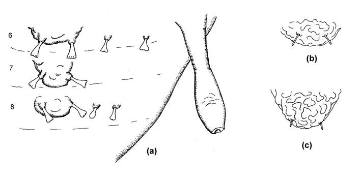 Fig.37 Apterae on Lepidium; (a) SIPH and processes on ABD TERG 6-8 of Landisaphis davisi, (b) Process on ABD TERG 8 of Lipaphis lepidii, (c) Same for Lipaphis ruderalis.