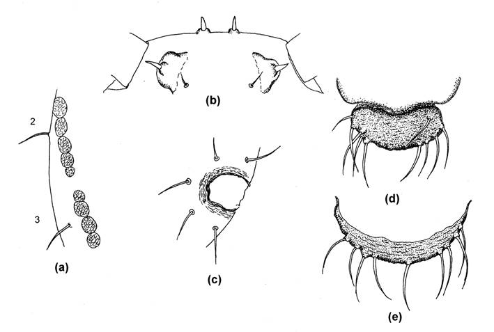 Fig.39 Apterae of Tuberaphis on Loranthus and related genera; (a) Marginal wax glands of Tuberaphis loranthi, (b) Ventral side of front of head of T. loranthi, (c) SIPH of T. loranthi, (d) Cauda of T. loranthi, (e) Cauda of T. scurrulae.
