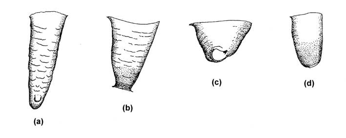 Fig.41 Apterae on Peucedanum; (a) SIPH of Defractosiphon franzi, (b) SIPH of Hyadaphis coriandri, (c) SIPH of Semiaphis cervariae, (d) SIPH of S. horvathi.