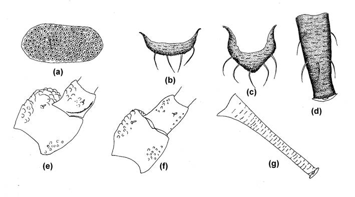 Fig.45 Apterae on Ranunculus; (a) Dorsal abdominal wax plate of Thecabius affinis, (b) Cauda of Miyazakia ranunculi, (c) Cauda of Dysaphis ranunculi, (d) SIPH of Miyazakia ranunculi, (e) ANT I and II of Tubaphis clematophila (dorsal side), (f) Same for Tubaphis ranunculina, (g) SIPH of T. ranunculina.