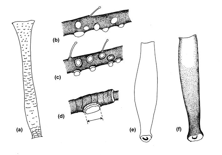 Fig.49 Apterae on Solidago; (a) SIPH of Illinoia goldamaryae, (b) Secondary rhinaria on ANT III of Uroleucon gravicorne, (c) Same for U. cadens, (d) Primary rhinarium on ANT V of U. solidaginis, (e) SIPH of Cachryphora serotinae, (f) SIPH of C. canadensis.