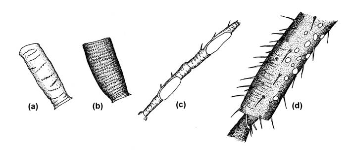 Fig.58 Aphids on Viburnum; (a) SIPH of spring migrant alata of Ceruraphis eastopi (type); (b) SIPH of spring migrant alata of C. viburnicola, (c) ANT V and BASE VI of spring migrant alata of C. eastopi (type), (d) End of hind tibia of spring migrant alata of C. viburnicola.