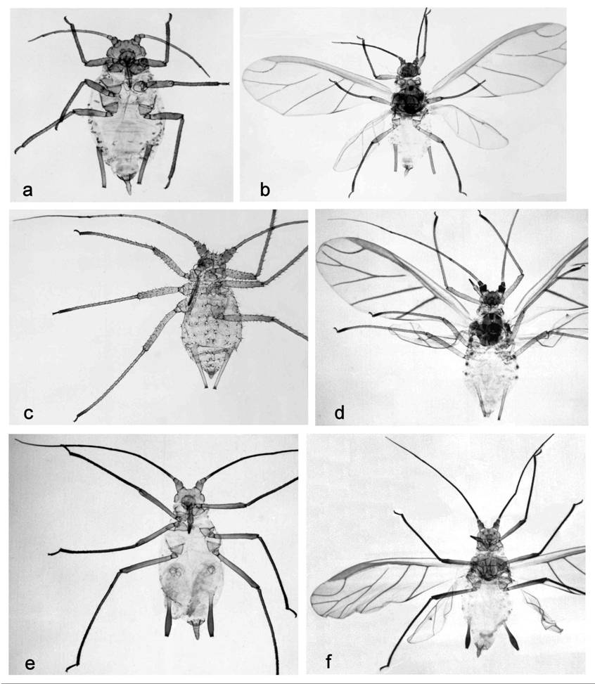 (a) Elatobium abietinum, aptera; (b) E. abietinum, alata;