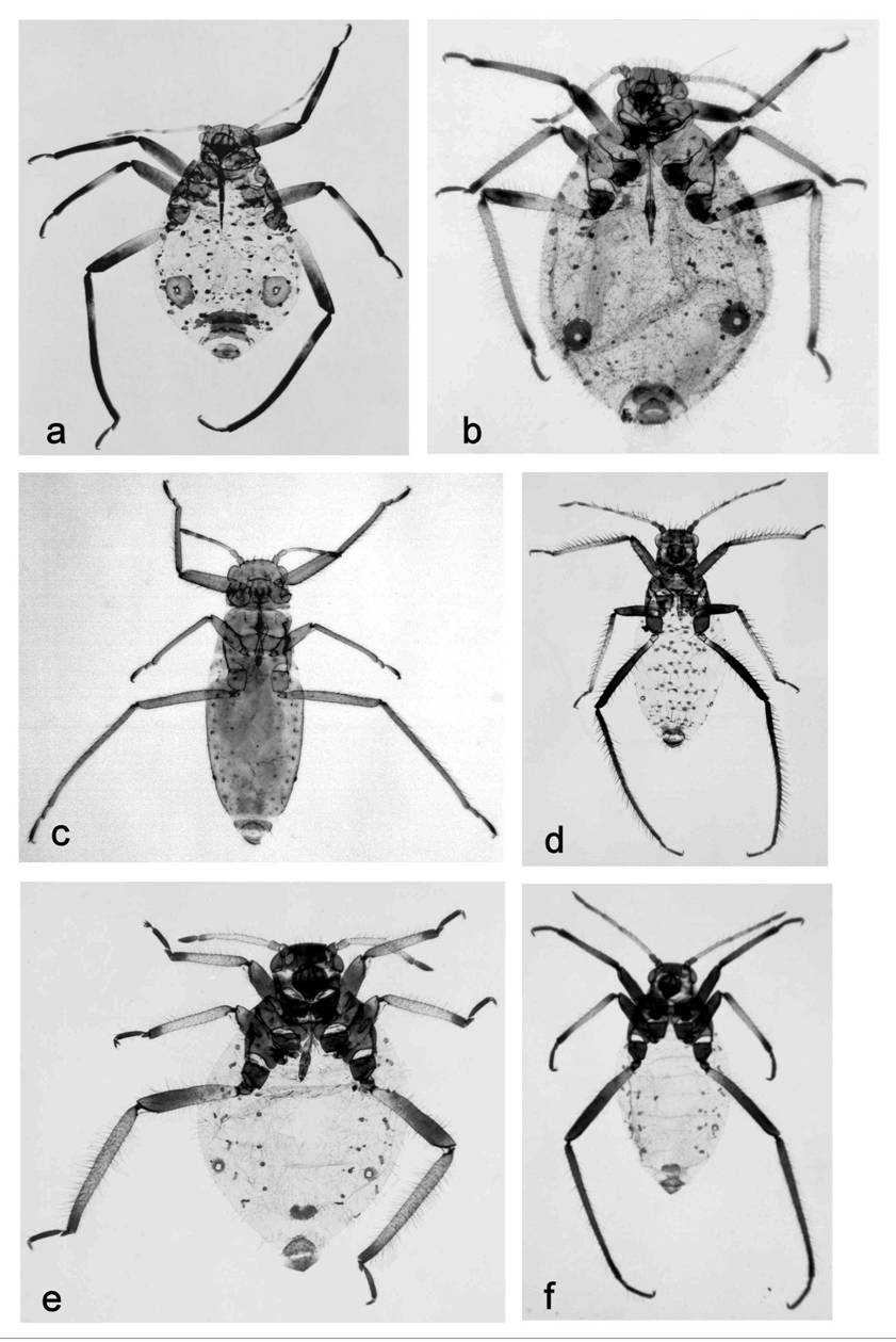 (e) Schizolachnus pineti, aptera; (f) S. piniradiatae, aptera.