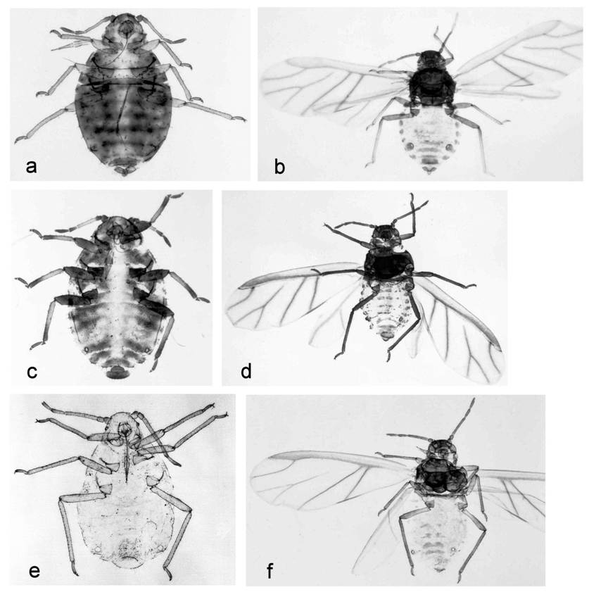 (c) Glyphina betulae, aptera; (d) G. betulae, alata;
